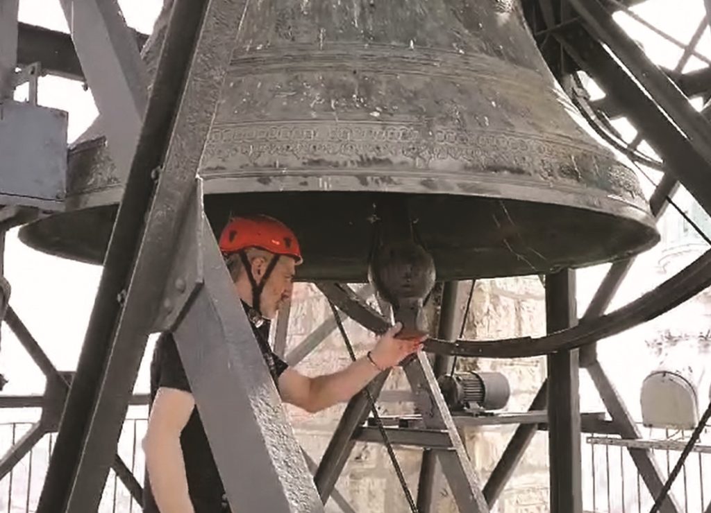 “A mezzogiorno – spiega il presidente Luca Fiocchi -, al termine del Pontificale di monsignor Pierantonio Tremolada, Vescovo di Brescia, i campanari della Federazione sono saliti sulla Torre per riproporre un suono antico, il suono della tradizione plurisecolare che è stata condotta manualmente fino alla metà del Ventesimo secolo. Il suono manuale delle campane raccoglie la suggestività dell’originalità del tocco dell’essere umano, che il motore elettrico, pure per potenza e regolarità, non potrà mai imitare. Proprio nel corso degli ultimi anni si era osservata la possibilità di riagganciare le corde per poter suonare manualmente le tre campane, a differenza della Torre Civica di Bergamo, il tradizionale Campanù, dove i tre bronzi sono interamente automatizzati e non suonabili manualmente. L’inceppatura in stile semi-ambrosiano delle campane della Torre del Pégol rende invece possibile questa riproposta antica”.