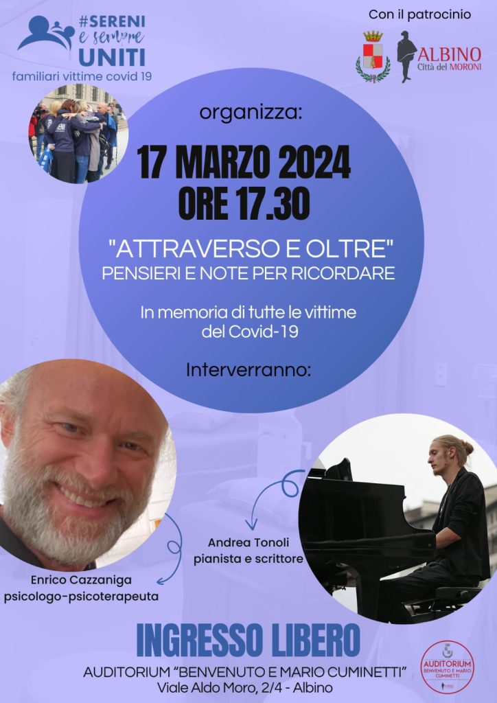 L’Associazione #Sereniesempreuniti ha organizzato un evento speciale di commemorazione per le vittime del Covid-19, intitolato “Attraverso e oltre – pensieri e note per ricordare”, che si svolgerà ad Albino domenica 17 marzo, alle 17.30, presso l’Auditorium comunale Cuminetti. Un incontro in occasione della Giornata nazionale in memoria delle Vittime del Covid-19 del 18 marzo, un giorno simbolico per la città di Bergamo e per tutto il Paese.