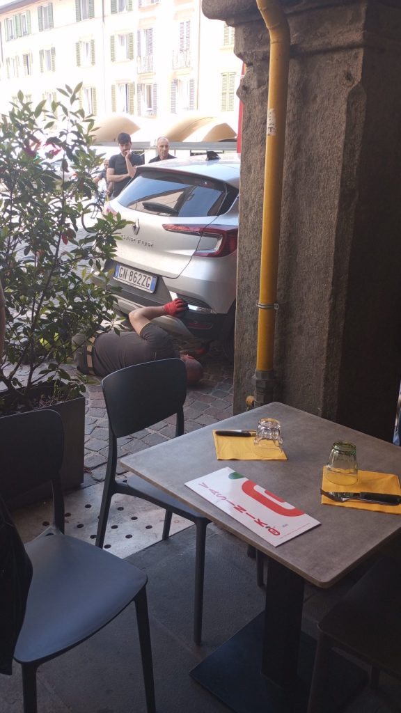 Avventura decisamente insolita per un gattino bianco-tigrato, messo in salvo dall’intervento dei Vigili del Fuoco dopo essere rimasto incastrato sotto il pianale di un’auto in sosta di fronte ai portici di piazza Pontida quasi all’intersezione delle Cinque Vie.