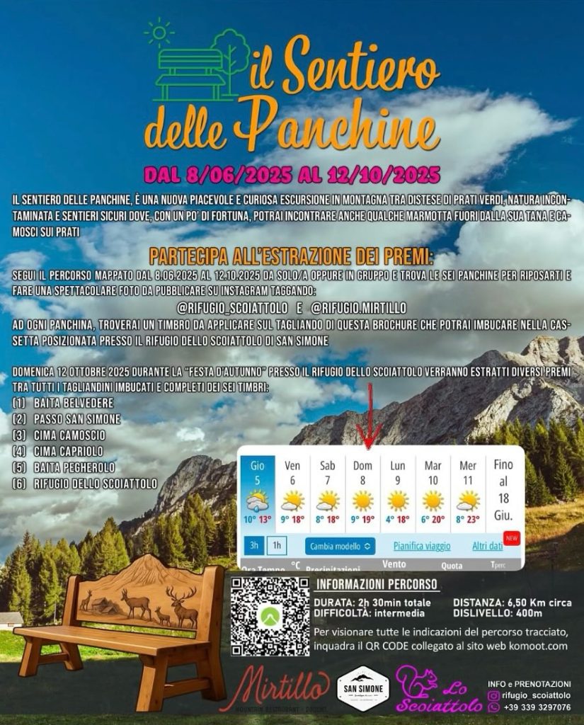 L’idea del Sentiero delle Panchine rappresenta una modalità innovativa di vivere la montagna, stimolando l’interesse per l’escursionismo e promuovendo l’area di San Simone come meta turistica accessibile e ricca di fascino. Oltre al valore paesaggistico, il progetto mira a coinvolgere attivamente i visitatori, trasformando la camminata in una scoperta partecipativa.