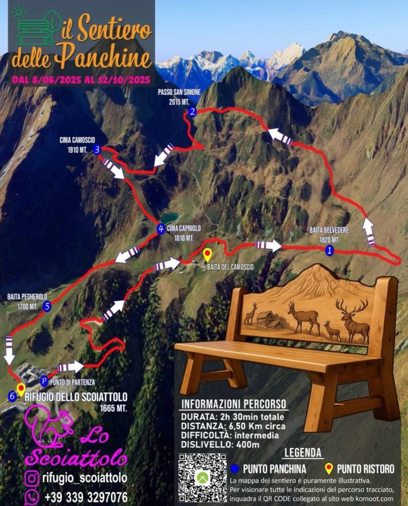 Le sei panchine decorate sono posizionate nei punti chiave del percorso: Baita Belvedere, Passo San Simone, Cima Camoscio, Cima Capriolo, Baita Pegherolo e infine il Rifugio dello Scoiattolo. Ogni panchina custodisce un timbro personalizzato: l’escursionista può apporlo su un’apposita scheda da gioco.