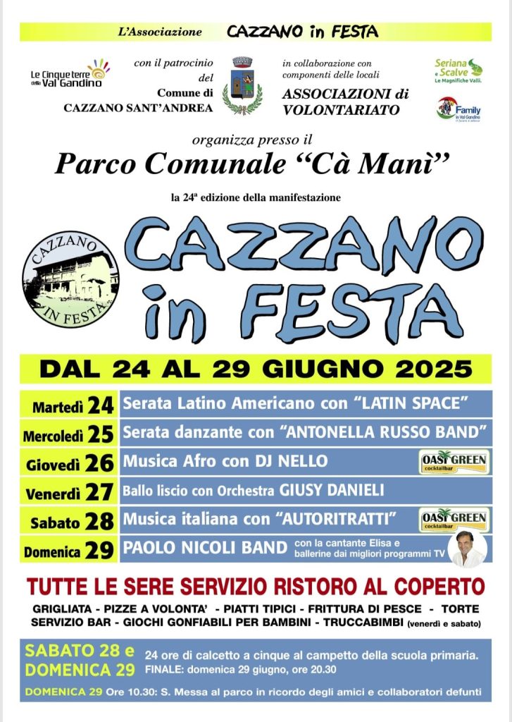Da martedì 24 a domenica 29 giugno, il Family Park di Cà Manì a Cazzano Sant’Andrea ospita la 24esima edizione di Cazzano in Festa, una delle manifestazioni più longeve e amate dell’intera Val Gandino. Organizzata dall’associazione Cazzano in Festa con il patrocinio del Comune, la manifestazione è resa possibile grazie alla collaborazione delle numerose associazioni di volontariato locali. Il programma offre una settimana ricca di musica, buon cibo, e divertimento per grandi e piccini.