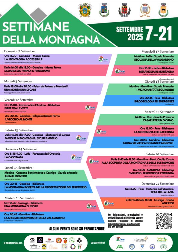 Tutti gli eventi sono gratuiti, ma alcuni richiedono prenotazione obbligatoria. Per maggiori informazioni, è possibile contattare l’Infopoint di Gandino al tel. 035.747893 o via email all’indirizzo infopoint@comune.gandino.bg.it. Il programma completo è disponibile sul sito ufficiale del Comune di Gandino www.comune.gandino.bg.it/it/eventi/settimana-della-montagna-2025.