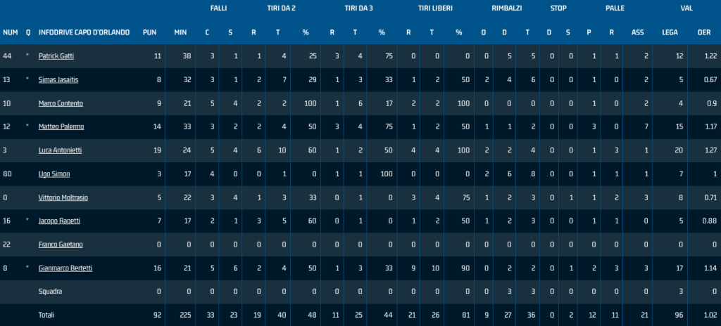 Infodrive Capo d’Orlando: Bertetti 16 (2/4, 1/3), Palermo 14 (2/4, 3/4), Gatti 11 (1/4, 3/4), Jasaitis 8 (2/7, 1/3), Rapetti 7 (3/5, 0/1); Antonietti 9 (6/10, 1/2), Contento 9 (2/2, 1/6), Simon 3 (0/1, 1/1), Moltrasio 5 (1/3, 0/1); NE Gaetano.
