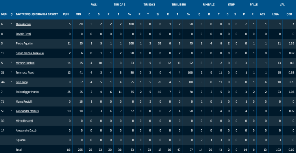 TAV Treviglio: Anchisi 5 (2/2, 0/0), Rubbini 14 (1/3, 0/5), Rossi 2 (4/8, 0/3), Taflaj 9 (1/4, 1/5), Marciuš 0 (4/7, 0/0); Anaekwe 2 (1/2, 0/0), Restelli (0/0, 0/2), Morina 25 (6/11, 2/5), Agostini 11 (1/1, 1/3); NE Reati, Daccò, Rossetti.