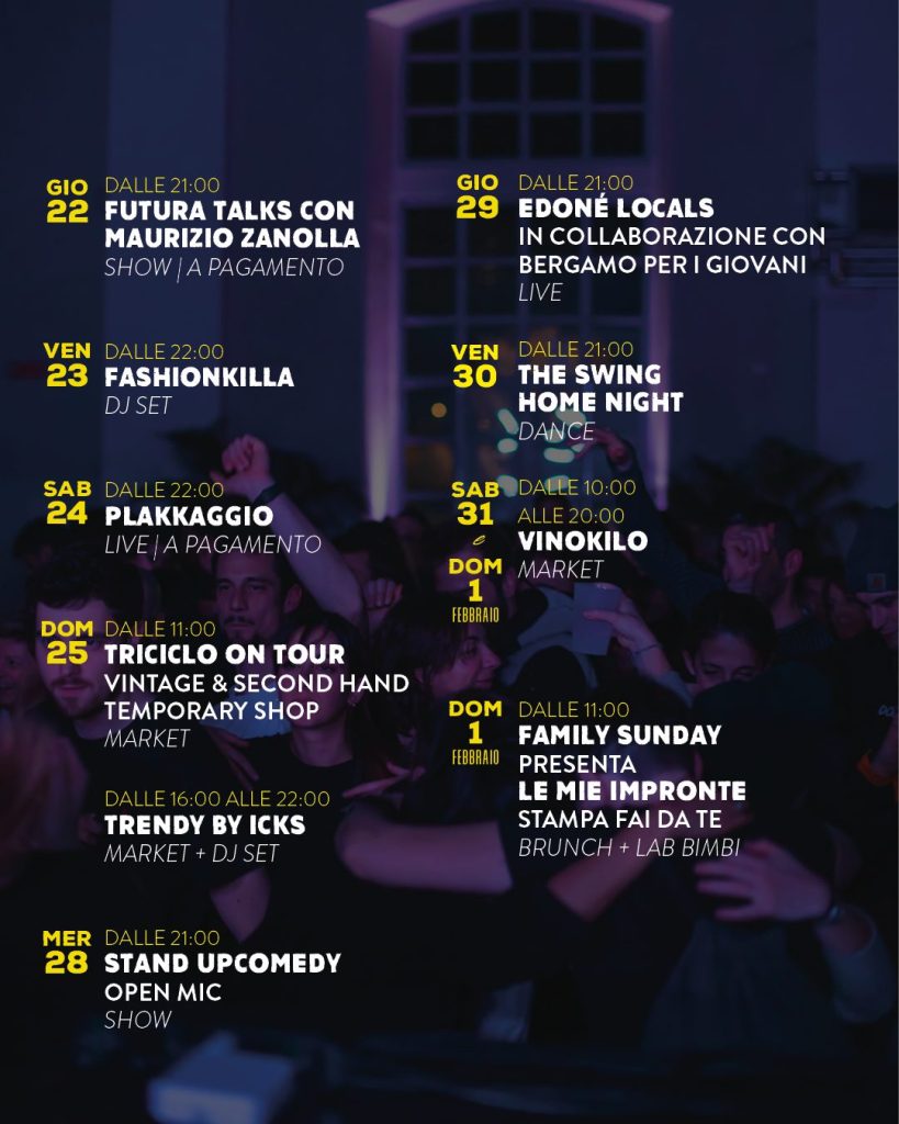 Il DASTE di Bergamo, ex centrale idroelettrica della Celadina, è un centro che ospita numerosi eventi, e Avanzi di Balera è solo uno dei tanti appuntamenti di gennaio. Tra gli altri eventi in programma, ci sono: