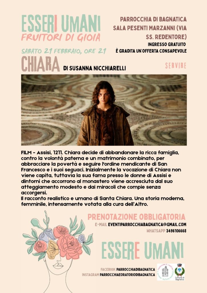 Il 21 febbraio 2026, alle ore 21, la rassegna prenderà il via con la proiezione del film “Chiara”, diretto da Susanna Nicchiarelli. Il film, ambientato ad Assisi nel 1211, racconta la storia di Chiara Scifi, una giovane che decide di abbandonare la sua famiglia benestante e un matrimonio combinato per seguire San Francesco e il suo ordine mendicante. Il film esplora la sua vocazione, inizialmente non compresa, e il suo cammino verso una vita dedicata alla povertà, alla fede e alla cura degli altri, incarnando perfettamente la parola chiave “servire”. Chiara è il racconto realistico e umano di una donna del suo tempo, ma dai tratti moderni: la sua femminilità diventa un’opportunità per dedicarsi completamente alla cura dell’altro.