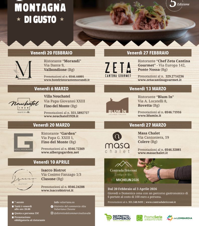 “Montagna di Gusto arriva alla quinta edizione e conferma un’idea semplice, che in questi anni ha funzionato: raccontare ValSeriana e Val di Scalve attraverso la tavola, mettendo in rete ristoratori e territorio. Il format resta quello collaudato perché è proprio la continuità, insieme alla qualità dei menu, ad aver costruito il successo delle passate edizioni. Quest’anno, siamo molto lieti delle tre nuove adesioni, che portano nuove firme e nuove interpretazioni della cucina di montagna, accanto ai ristoranti che hanno dato identità alla rassegna fin dall’inizio. Il nostro invito è quello di sedersi a tavola e scoprire, piatto dopo piatto, un territorio che sa sorprendere restando fedele alle sue radici”, dichiara Michele Lazzaretti, Presidente del Distretto del Commercio Alta Valle Seriana-Clusone.
