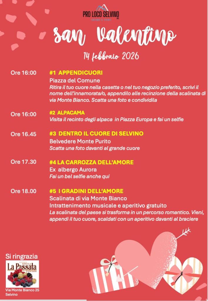 La giornata si conclude sulla scalinata di via Monte Bianco, trasformata in un concentrato di cuori, luci e atmosfera romantica. Gli innamorati, infatti, potranno appendere i cuori in legno ritirati durante la giornata – oppure nei vari esercizi commerciali del paese – creando un’installazione collettiva che racconta l’amore di Selvino, dando vita a un’opera condivisa.