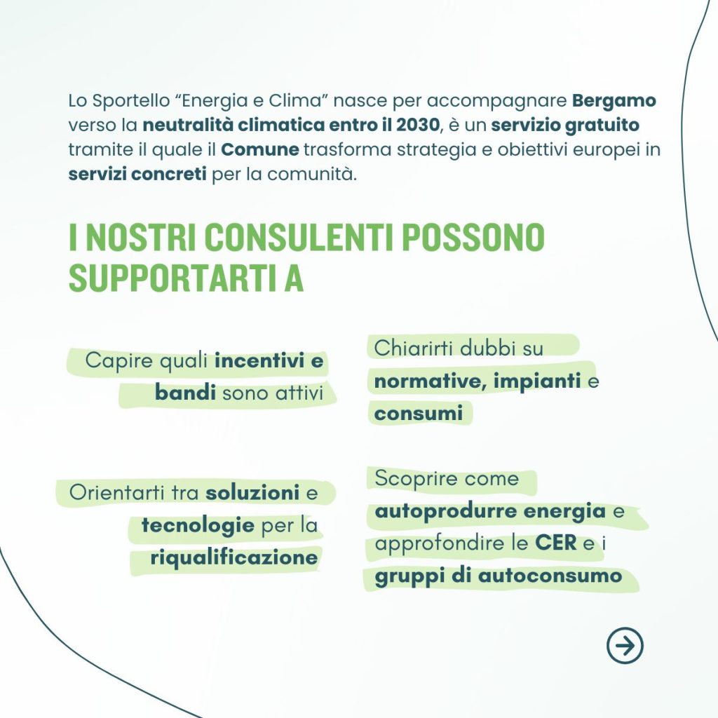 Per un futuro più verde e condiviso, è prenotabile un appuntamento per una consulenza visitando il sito ufficiale dello Sportello Energia Bergamo: sportelloenergiabergamo.it.