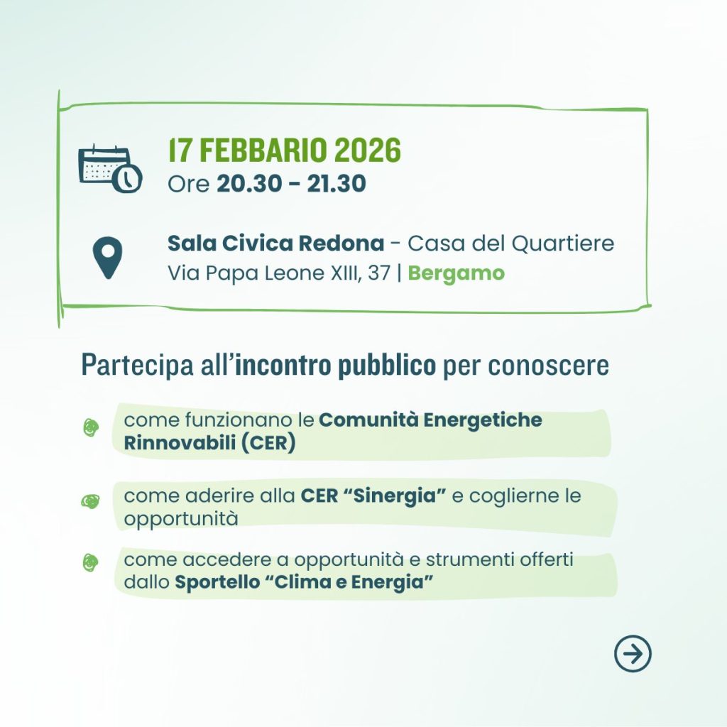 Il Comune di Bergamo invita i cittadini a scoprire le potenzialità delle Comunità Energetiche Rinnovabili (CER) durante un incontro gratuito martedì 17 febbraio alle 20:30. L’appuntamento avrà luogo presso la Sala Civica Redona, Casa del Quartiere, in via Papa Leone XIII, 37, a Bergamo. Sarà l’occasione per approfondire come funziona una Comunità Energetica Rinnovabile e come aderire alla CER “Sinergia”, un’iniziativa che punta a rendere il territorio più sostenibile e a ridurre l’impatto ambientale.