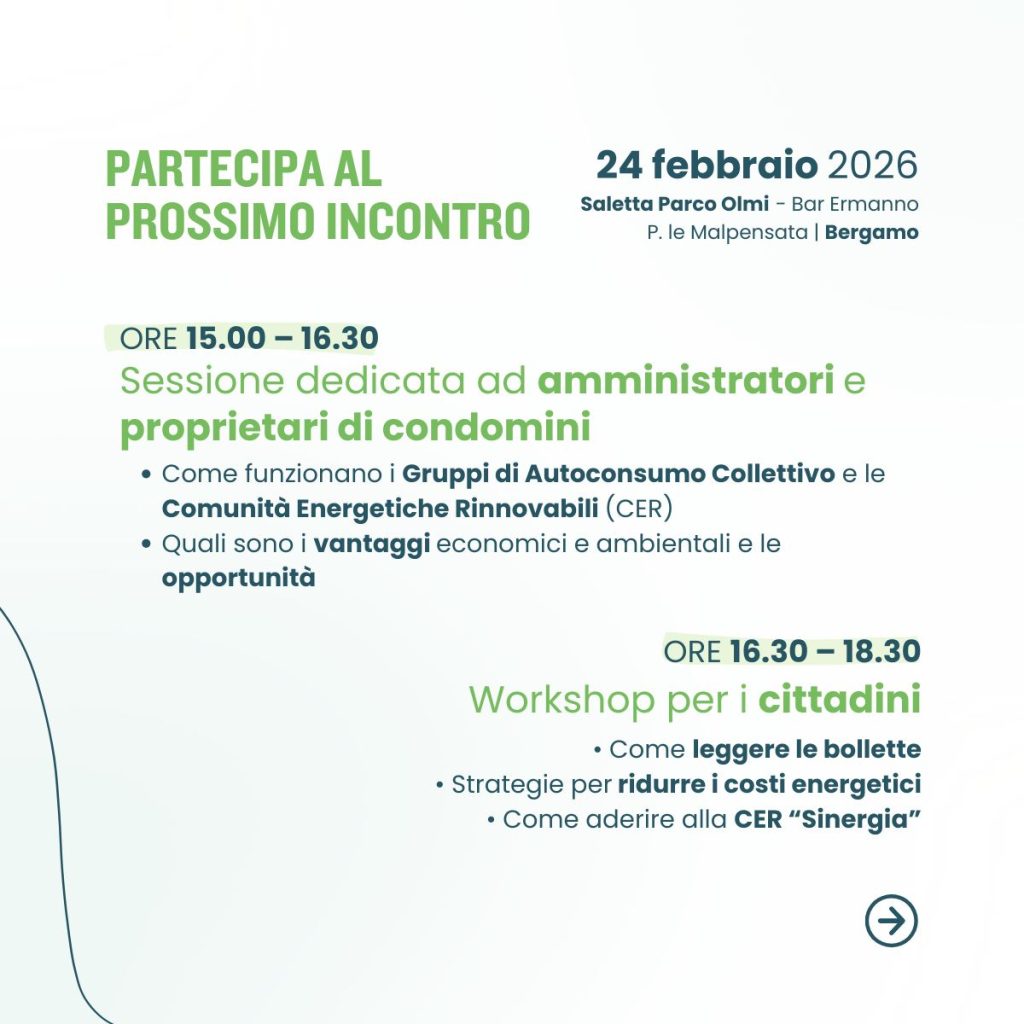 Il primo appuntamento è il calendario il 24 febbraio, dalle ore 15.00 alle 16.30, presso la Saletta privata del Parco Olmi – Bar Ermanno, in piazzale Malpensata in città. L’incontro sarà dedicato a spiegare il funzionamento dei Gruppi di Autoconsumo e delle Comunità Energetiche Rinnovabili (CER). Durante la sessione, i partecipanti avranno l’opportunità di scoprire i vantaggi economici e ambientali derivanti dalla partecipazione a queste iniziative collettive, che consentono di produrre e condividere energia rinnovabile. Sarà anche un’occasione per esplorare le opportunità offerte sul territorio, contribuendo attivamente alla transizione energetica e alla creazione di una comunità più resiliente e sostenibile.