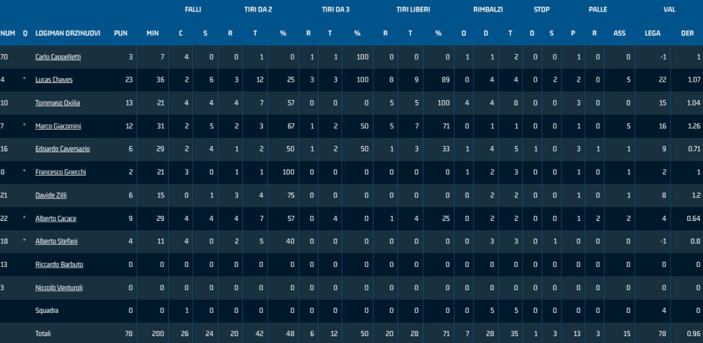 Logiman: Chaves 23, Giacomini 12, Cacace 9, Gnecchi 2, Stefani 4; Oxilia 13, Caversazio 6, Cappelletti 3, Zilli 6; Venturoli ne, Barbuto ne. All. Gabrielli.