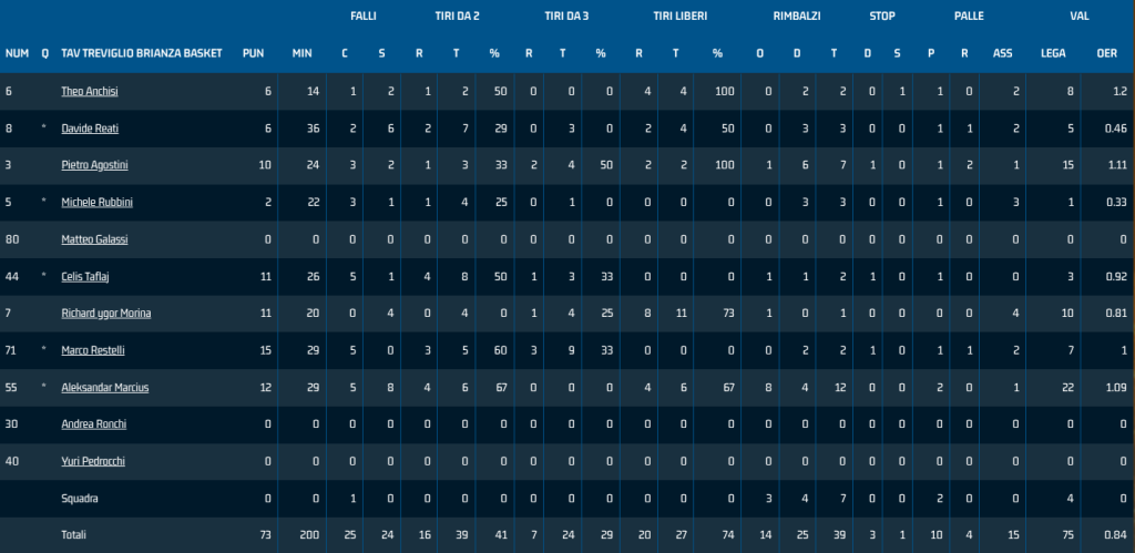 TAV: Rubbini 2, Restelli 15, Reati 6, Taflaj 11, Marciuš 12; Morina 11, Agostini 10, Anchisi 6; Galassi ne, Ronchi ne, Rossetti ne. All. Villa.