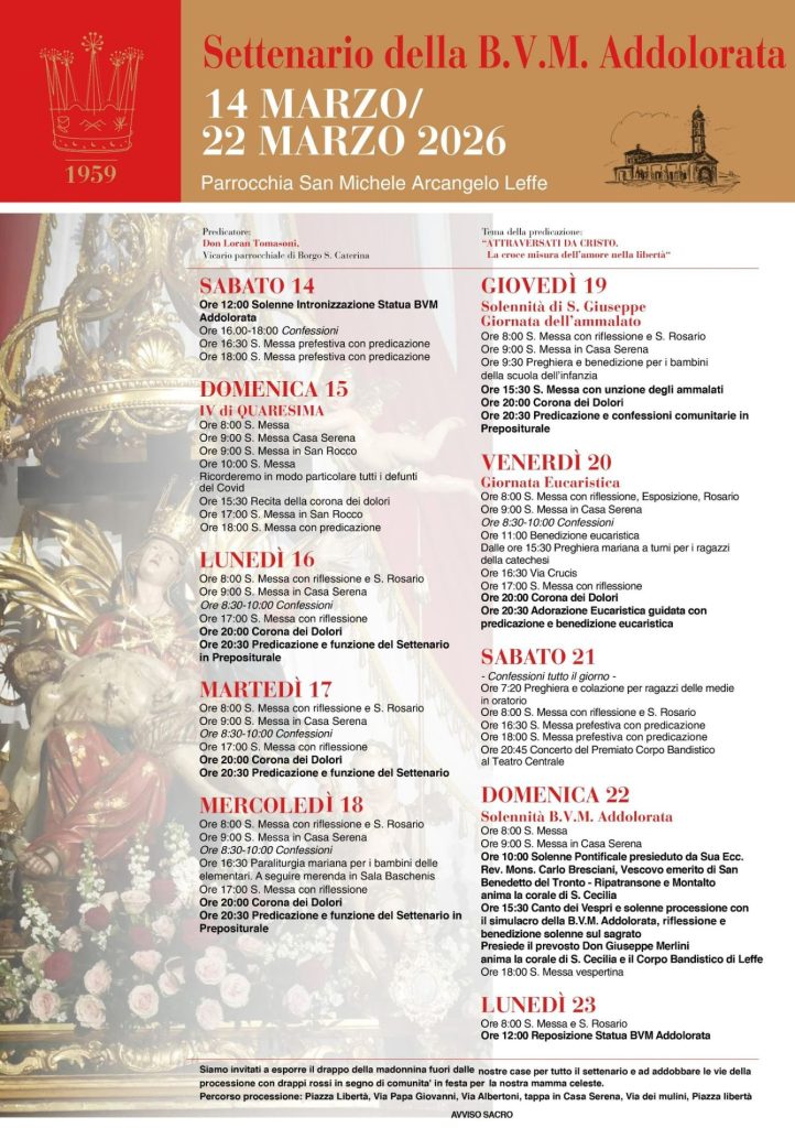 Il Settenario di preghiera a Leffe parte, domani, sabato 14 marzo, con celebrazioni destinate a chiudersi domenica 22 nella festa solenne. Questo evento è un momento speciale per la comunità locale, che celebra la Beata Vergine Maria Addolorata, detta affettuosamente la “Madonnina”.