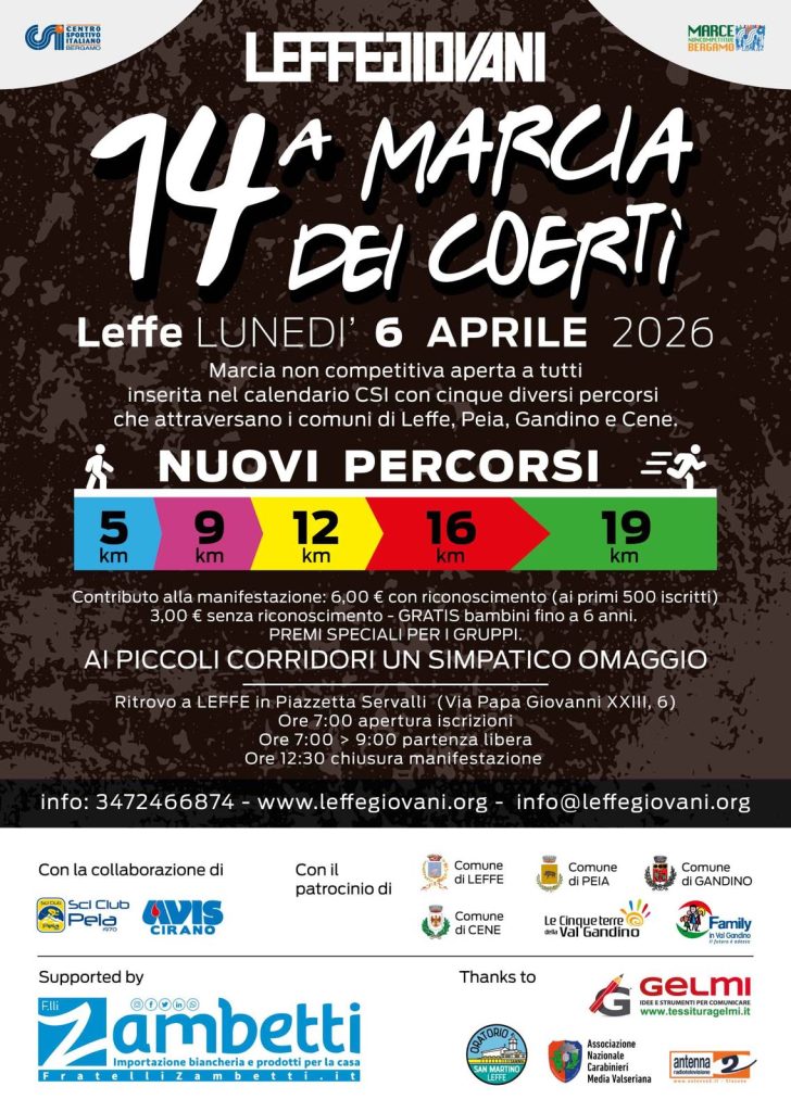 Lunedì 6 aprile, con partenza da Leffe, torna la tradizionale Marcia dei Coertì, con partenza tra le 7 e le 9 e la conclusione entro mezzogiorno e mezzo. L’evento non competitivo di Pasquetta, che fa parte del calendario CSI, si articola su cinque percorsi che attraversano i comuni di Leffe, Peia, Gandino e Cene. I partecipanti hanno l’opportunità di immergersi in paesaggi mozzafiato, che offrono panorami straordinari sulla Val Gandino e i suoi borghi. La camminata ripercorre i luoghi storici legati ai “copertini”, gli ambulanti leffesi che, nel secolo scorso, viaggiavano in tutta Italia per vendere i prodotti tessili della Val Gandino. Questi mercanti erano pionieri del commercio, un po’ come i primi “tele-venditori”, creando uno spettacolo che attirava migliaia di persone nelle piazze italiane.